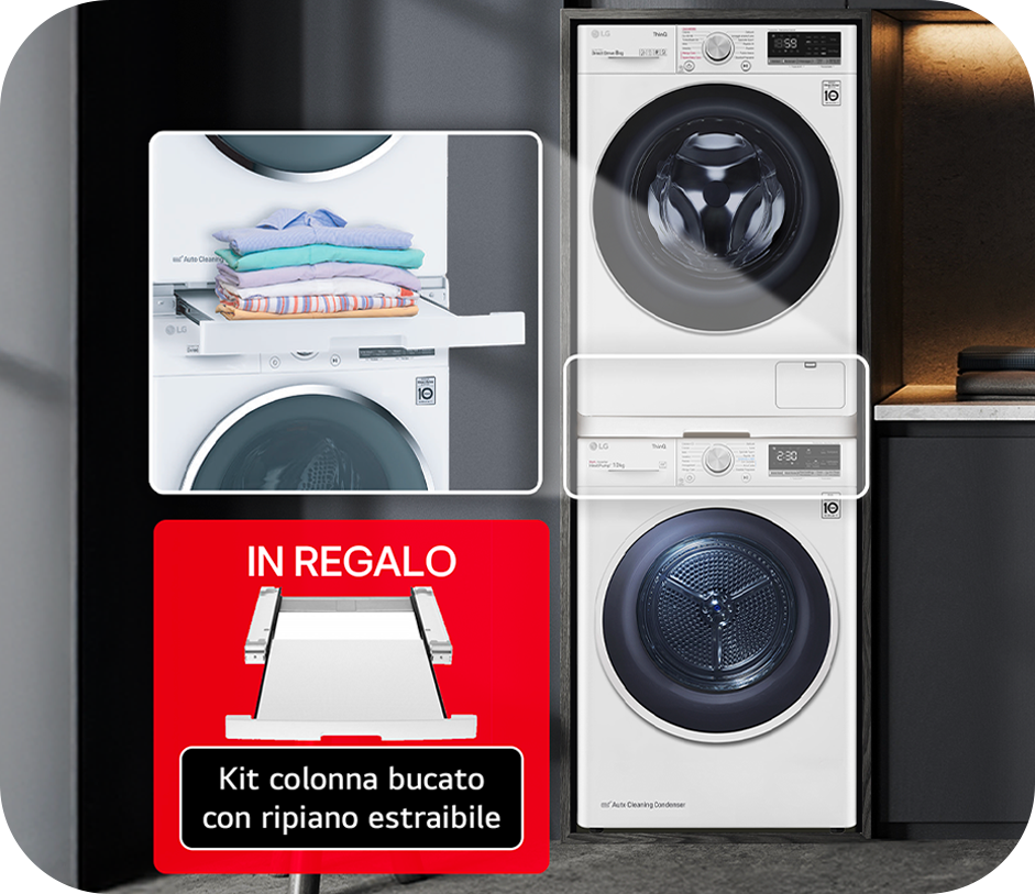 Acquista un'asciugatrice LG in promozione, registra il tuo acquisto e per te un Kit colonna bucato in regalo.
